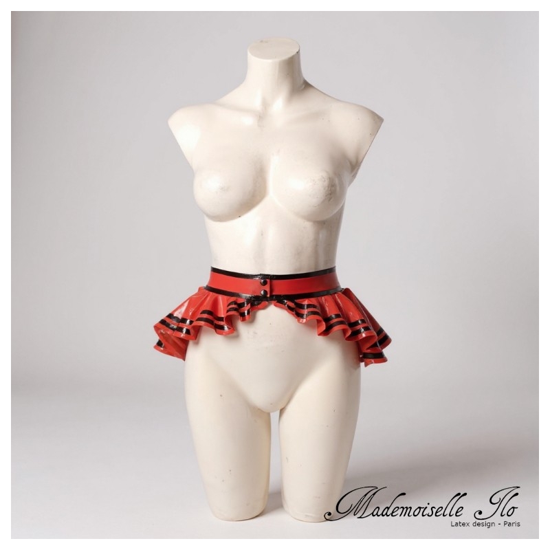 Belt fastens at the front with two snap buttons. The belt is embellished with a ruffle that widens at the back. The perfect accessory to add volume and flair to even your simplest outfits.