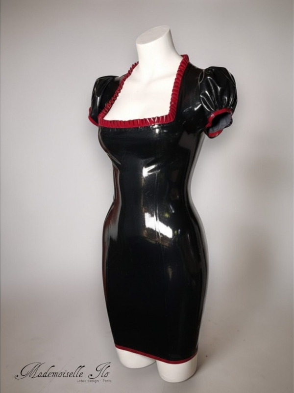 Mid-thigh length dress with balloon sleeves. The square neckline is trimmed with pleats. The dressopens at the back with a zipper.