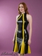Robe à emmanchure américaine et col cheminée. Six bandes parcourent verticalement la robe lui donnant un coté graphique. Les panneaux s' élargissent vers le bas pour une belle forme en corolle.