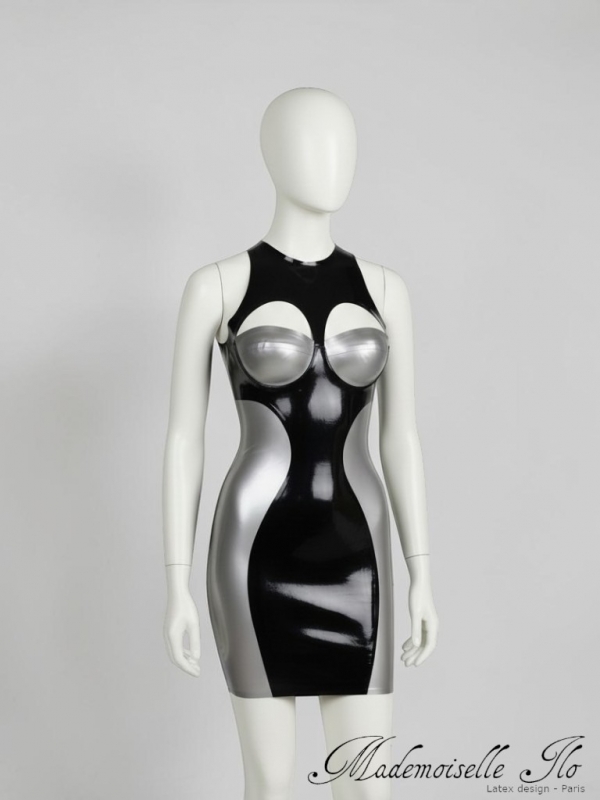 Tentation est une robe à encolure américaine. Le balconnet ainsi que les côtés sont traités d'une couleur différente que la partie centrale et le col, donnant l'impression de deux robes imbriquées l'une dans l'autre.