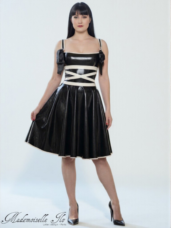 La robe Chérie se compose d'un bustier enserré d'un croisement de bandes de couleur de contraste et des bretelles se rattachant à la robe par des rubans en satin. Ces rubans peuvent être changés en fonction des accessoires et ainsi apporter un petit twist à la tenue.Le bas de la robe est un cercle complet apportant de jolies ondulations et du mouvement à chaque pas. Longueur de la jupe 60cm.