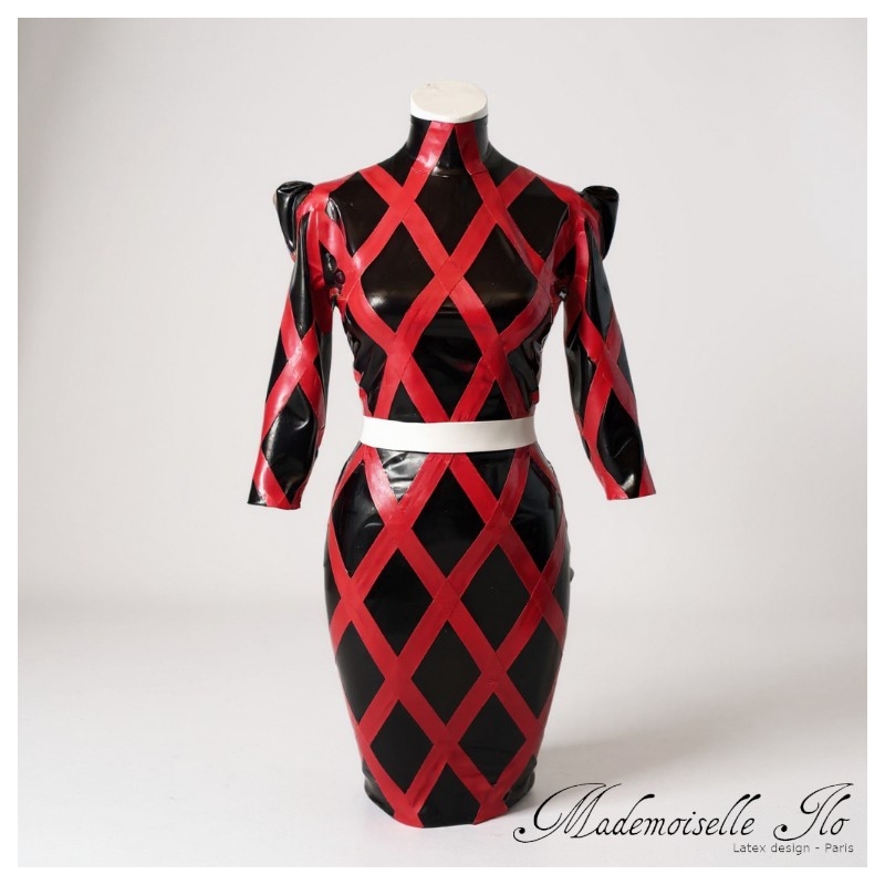 Le top s' orme d'un motif de losanges inspiré du costume d' Arlequin. La jupe longueur genoux s'ouvre jusque sous les fesses par une fermeture éclair. La jupe a les même motifs arlequin